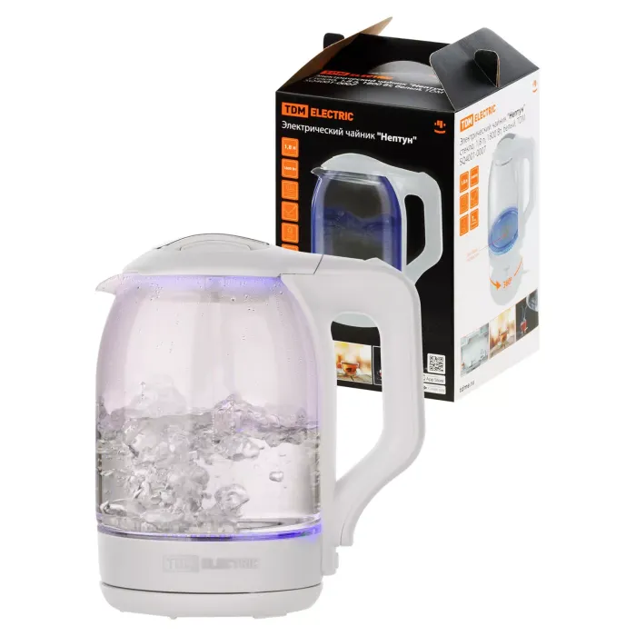 Электрический чайник "Нептун", стекло, 1,8 л, 1800 Вт, белый, TDM